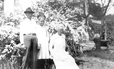 Mary Heath Ochiltree with her parents, Robert S. and Anna Randall Ochiltree, at their home in Avoca, Iowa, in the spring of 1917 with bridal-wreath spirea in the background. Robert was a rural mail carrier with a reputation for always getting the mail through regardless of the weather. Photographer unknown.
