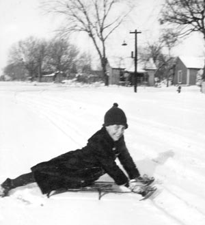 Mary Heath at age 12, sledding near her home in Avoca, February 1918. Electricity has come to Avoca by this time, as shown by the power pole and street light in the background. The object to the right of the power pole at ground level appears to be a fire hydrant. Photographer unknown. |
