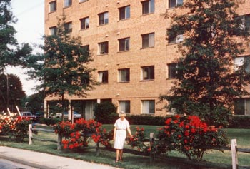 Mary Heath Sweet in front of Quinton Arms apartments, 4020 North Washington Blvd, Arlington, VA, 6 June 1974. Her apartment is #202, the four second-floor windows above the lobby and driveway at left three windows obscured by the tree and the 4th just to the right of it.