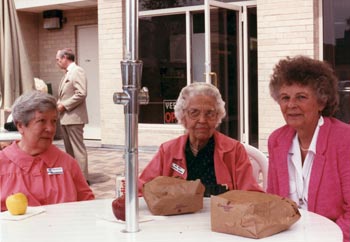 Mary Heath served as a volunteer at Columbia Hospital for Women in Washington, DC, for many years following her retirement from teaching. Here she is shown with Irene Underwood and Eve Gresser (R) at a hospital picnic, 20 May 1988. Photographer unknown.