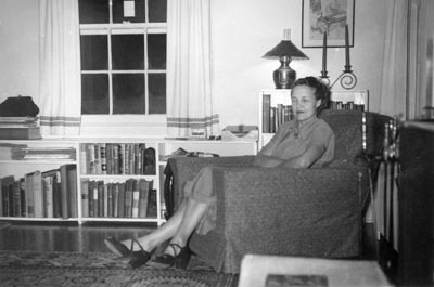 Mary Heath in her living room in Falls Church in 1955. Everything in the photo except the curtains, the low bookcase, and a few of the books we still own today. I can even identify some of the books despite the rather fuzzy photo.