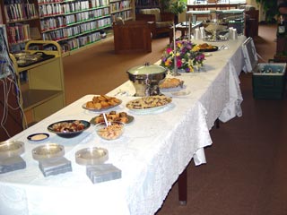 | Harriet Whitelaw, one of Mothers helpers, signs the guest book. | The buffet table is set, awaiting the service to be over. Both photos by Rick Webb. |