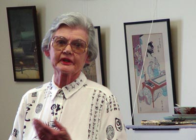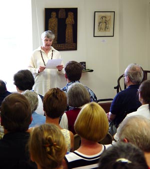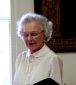 | Next, Jeanne Reedy, Mothers Chief of Staff (or Head Angel) spoke very movingly of their relationship over the past six years. | Then Connie Young, whose mother was also a teacher at the Peking American School when my mother was there, spoke at length about the school and her long friendship with Mary Heath. Both photos by Rick Webb. |