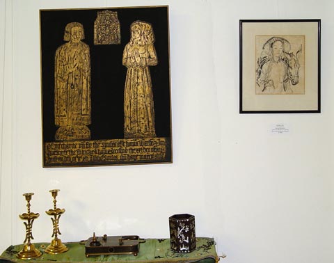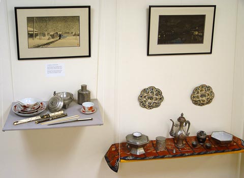 More pewter ware and china and several other items. The grey and brown china at left was her everyday table service, though not when I was a child! In front of the china are several ivory items. The one closest to the dishes is a sheath containing a knife and a set of chop sticks, all of ivory. The rosettes on the wall are silk tapestries.