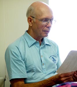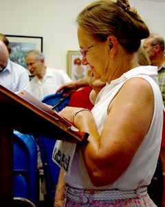 | John Sweet opened the service by welcoming everyone and telling a few anecdotes, one of them about his grandfathers love for sailing ships. Here I am reading Sea Fever by John Masefield. Mothers request for this was likely inspired by her father. | Daughter-in-law Char Sweet first read The Sun is Rising by W. R. Hunt and here is reading High Flight by John Magee, Jr. Both photos by Rick Webb. |
