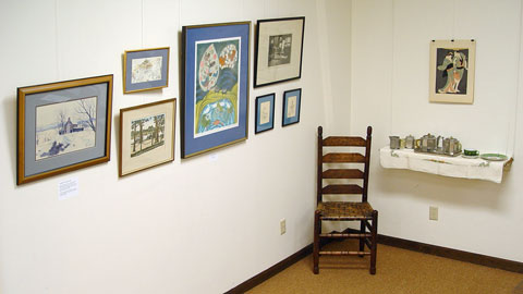 Overview of the northeast corner of the exhibit room. The chair is one of a set that Mom and Dad had made while they were in Oklahoma in the mid-30s. They are walnut with split-hickory seats. They were made by an elderly Indian named Go Back Christie for $4 each, or so I was told.