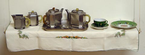 Several items of pewter ware and china. The cream and sugar service was used every day. I remember them from early childhood and the sugar bowl was on her table the day she died. The green china was used only when we had company.