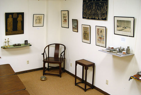 Overview of the southeast corner of the exhibit room. The chair and table are Chinese and are very heavy. I do not know what type of wood they are but I will try to learn that and anything else I can about them.
